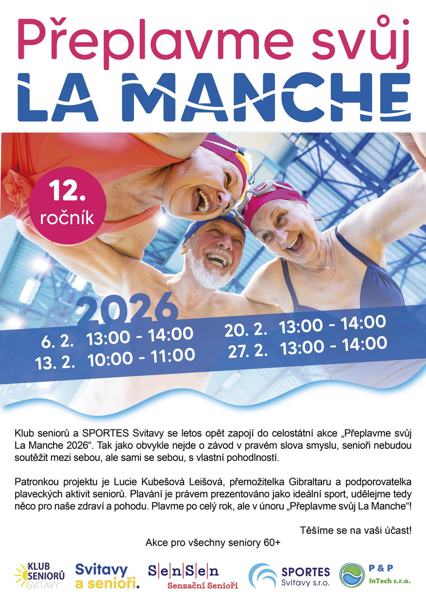 Klub seniorů a SPORTES Svitavy se letos opět zapojí do celostátní akce „Přeplavme svůj La Manche 2026“. Tak jako obvykle nejde o závod v pravém slova smyslu, senioři nebudou soutěžit mezi sebou, ale sami se sebou, s vlastní pohodlností. Patronkou projektu je Lucie Kubešová Leišová, přemožitelka Gibraltaru a podporovatelka plaveckých aktivit seniorů. Plavání je právem prezentováno jako ideální sport, udělejme tedy něco pro naše zdraví a pohodu. Plavme po celý rok, ale v únoru „Přeplavme svůj La Manche“!